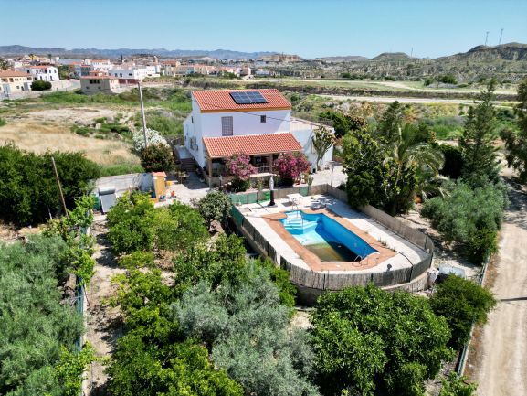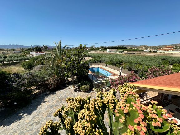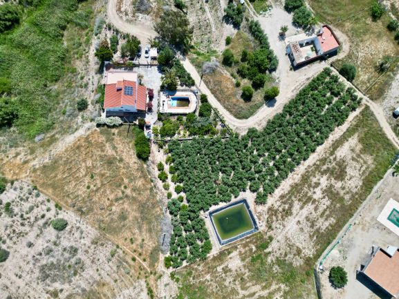 El exterior de la finca es un verdadero paraíso: más de 150 olivos, zonas ajardinadas con árboles frutales, sistema de riego por goteo en toda la parcela, balsa propia y derechos de agua. La piscina privada y las terrazas con vistas panorámicas al atardecer completan un ambiente exclusivo.